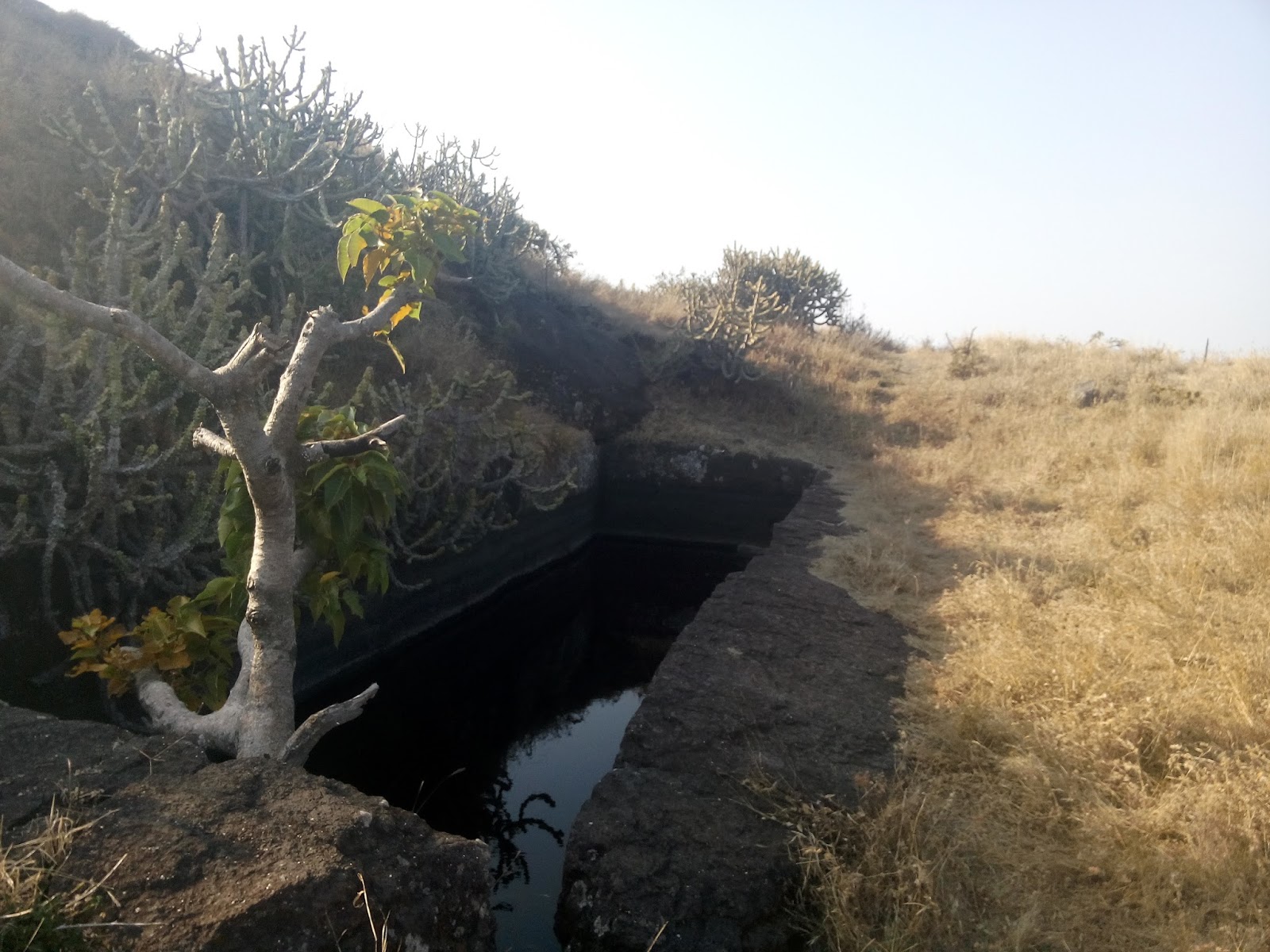 Rajdher fort is a paradise for explorers, there are lot of things to see on the fort. Immediately as you leave behind the steps you can see a well type structure. Ahead you can see a huge cave, where currently someone stays and has lot of goats inside the cave. There is a nice lake besides which stands a small Shiv Temple. There are potal water cisterns all over the fort, the cold water from those cisterns can't match any packaged drinking water. Drinking that water was so satisfying, we could hardly explain the experience, it re-energized us for the descend downwards towards Rajdherwadi.